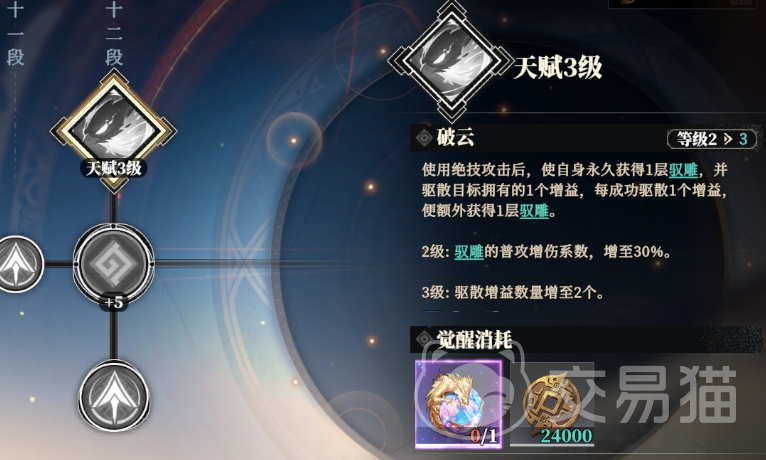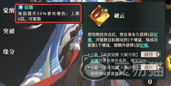 接下来就看天赋了,邹翊的天赋“破云”,是在使用绝技后自身获得1层驭雕buff,每层提供20%普攻伤害增益,同时还可以驱散一个目标敌人身上的增益,每成功驱散1个都可以获得1层驭雕buff。