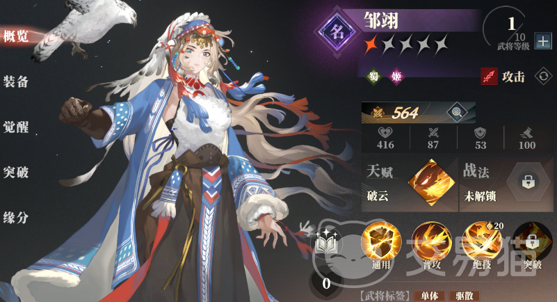 关于三国志幻想大陆2枭之歌邹翊怎么样的介绍就到这里,总的来看邹翊是一个功能型的单体输出武将,普攻伤害高,并且可以通过天赋获取的buff来打出追击,4层buff追击更是能指定单位,有较高的可操作性,此外邹翊的绝技能耗也不算高,只有20点,可以作为队伍中不错的点单输出手上阵使用。