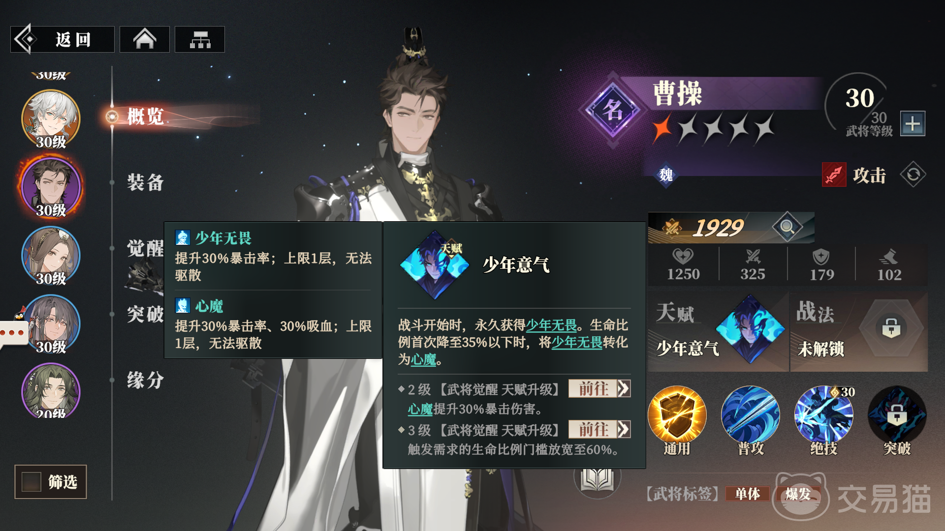 天赋效果“少年意气”,在战斗开始时,他会永久获取“少年无畏”;在他的生命值比例第一次降低到35%以下时,将“少年无畏”转化成心魔;“少年无畏”可提高曹操35%暴击率;“心魔”能提升30%暴击率的同时提高30%吸血,都是1层上限,但是不可被驱散;2级后心魔暴击伤害提升30%;3级时触发的生命值需求直接放宽到60%。