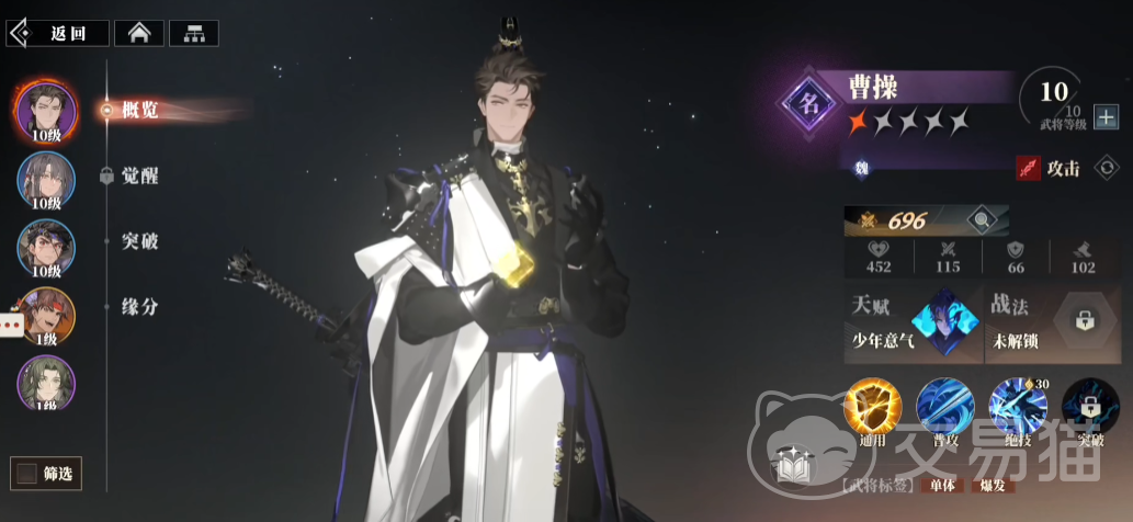 三国志幻想大陆2枭之歌曹操怎么样?曹操从立绘看起来是一名沉稳,但是意气风发的少年郎,“名”品质武将,作为一代枭雄,玩家朋友们对他的关注度自然是很高的,作为攻击型角色,他的能力状况也是大家考虑是否入手的原因之一,后续就整理了他的技能详情,感兴趣的朋友一起看看吧。