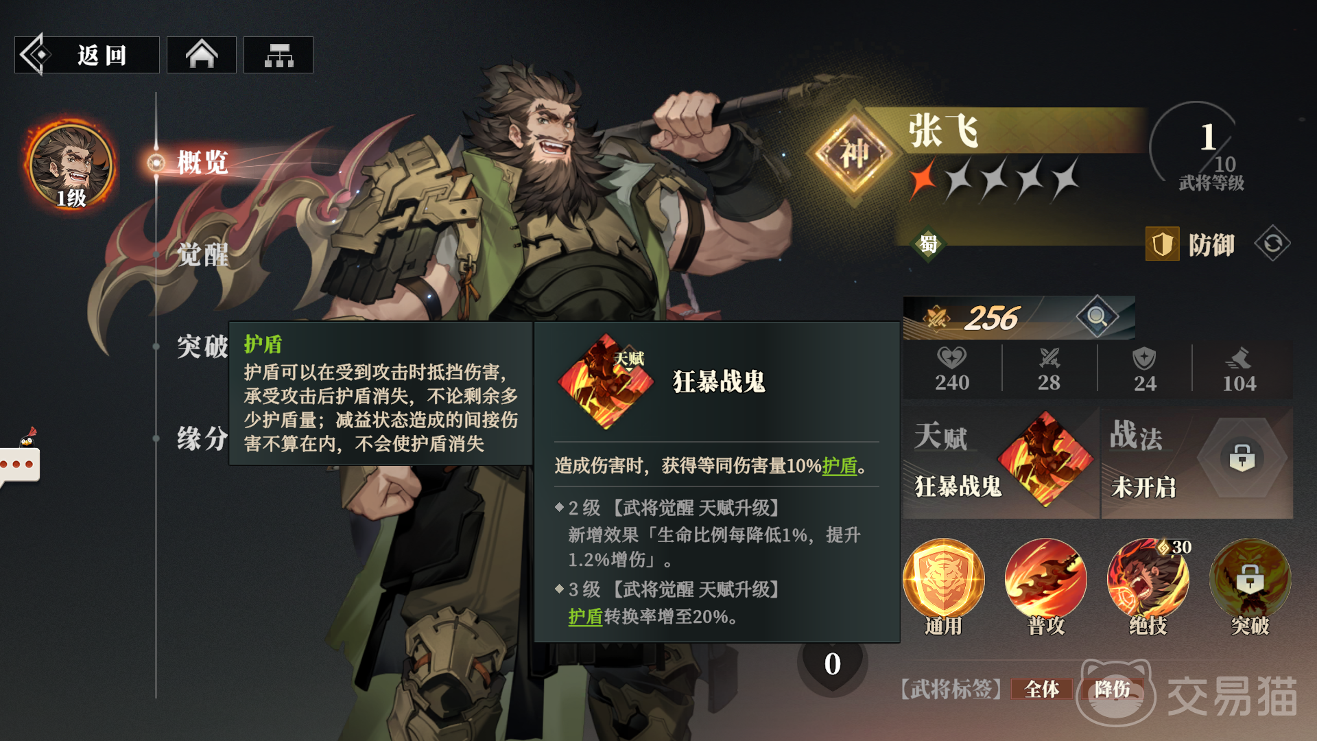 他的天赋效果“狂暴战鬼”,在他造成伤害时,获得等同于伤害量10%的护盾;2级时武将觉醒,天赋升级会新增一个效果,他的生命比例每降低1%,就会提升自己1.2%的增伤;3级时,护盾转换率提高到20%;