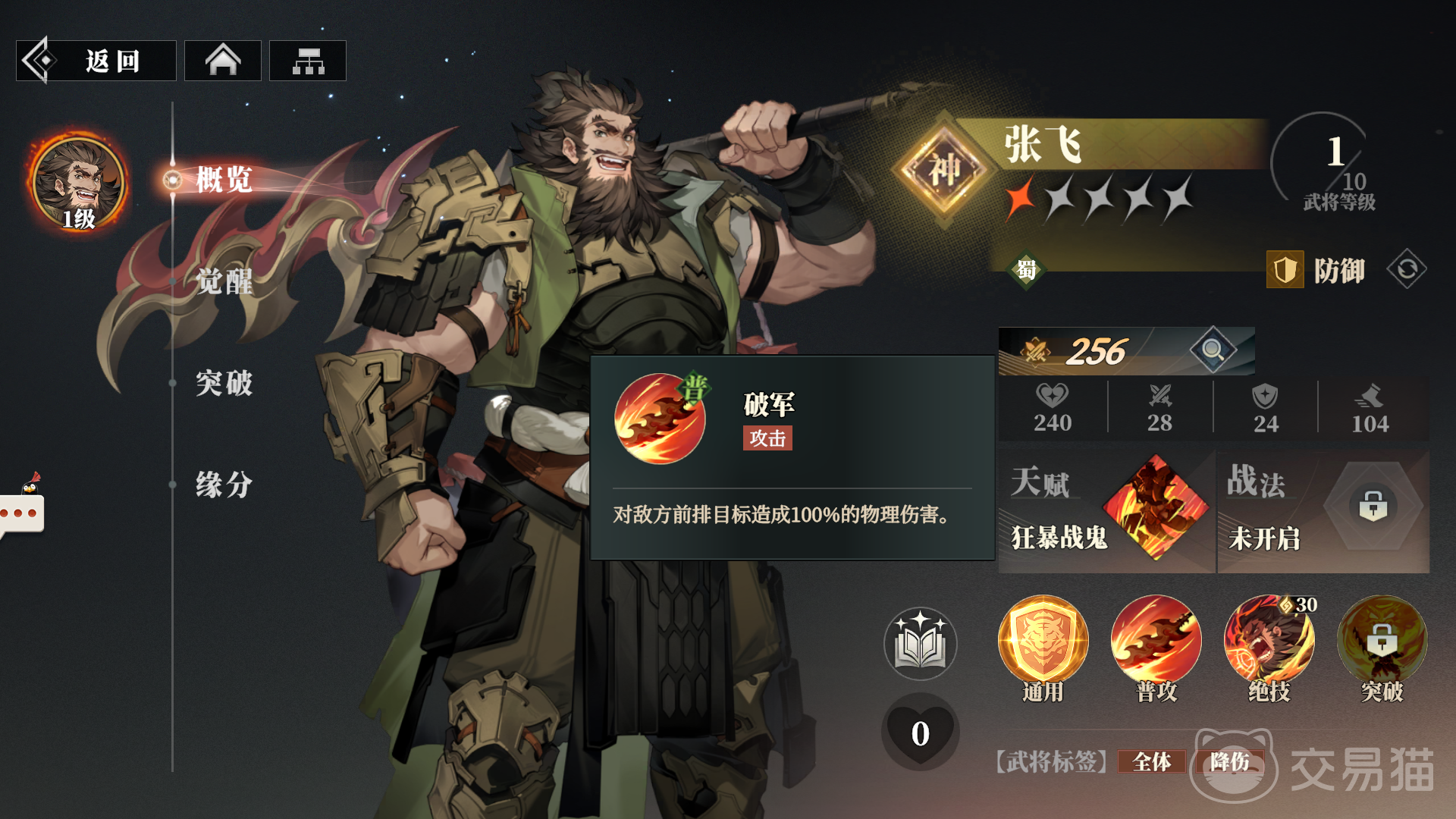 普通攻击“破军”,对敌方前排敌人造成100%物理损伤。绝技“燕云怒击”,对全体敌人造成104%的物理伤害,并对目标附加持续1回合的“破胆怒喝”,该效果会降低30%伤害增加,只能拥有1层;突破到2星,绝技伤害提高5%,突破4星后,绝技伤害提升至114%。