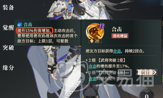曹昂的绝技“合击”则是可以指定友获取2回合的合击效果,队友获得15%的伤害增益,并且主动攻击后曹昂也会用普攻协助攻击一次该目标。升星可以提升合击伤害,最多提高至20%,可以给队伍中的厉害的输出型武将提供合击buff为其增伤。