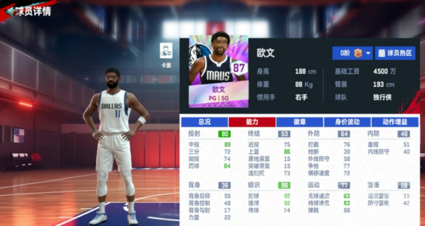 欧文不仅仅是个控卫,更是一个非常出色的得分手。无论是在游戏中,还是现实赛场上,他的投篮能力都很有威胁。在游戏内,他的中距离跳投稳定,命中率高,让你在空位时放心出手。更重要的是,欧文的三分能力也非常强,外线一旦得到空位,他的三分投篮可不容小觑!这样,他不仅能吸引防守,还能轻松拉开空间,为队友创造突破机会。玩起来绝对让你有打爆对手防线的爽快感。