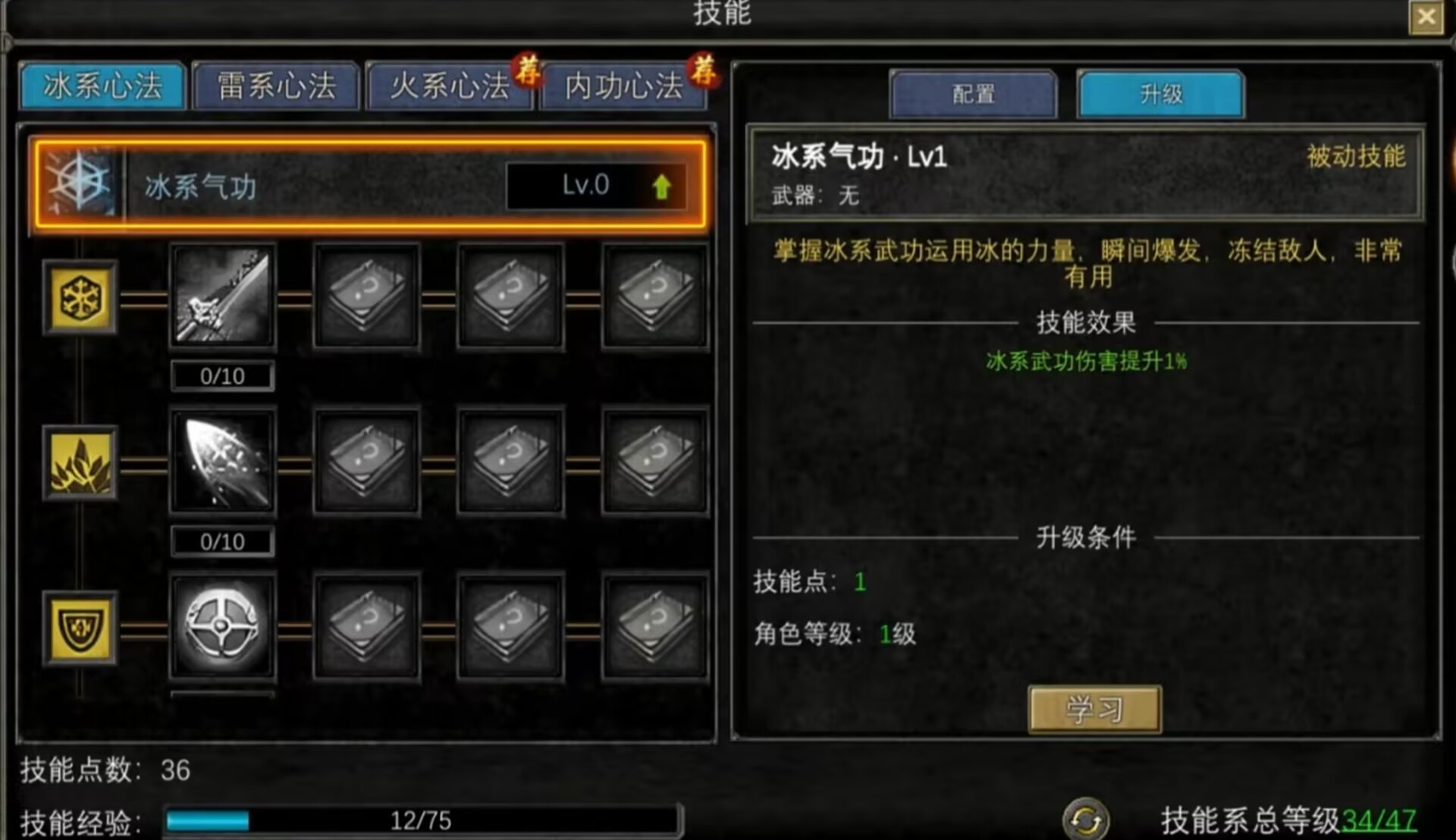 气功技能也是分三种元素术法和内功心法,冰系的有冰系小刀、火系的有火系大刀、雷系的有雷系长枪、内心功法有生生不息等等。每一个技能包含不同心法,效果也不一样。例如冰系小刀有冰心诀、寒气逼人等等心法,冰心诀可以增加冰属性防御,寒冰决则是在战斗时能大大增强冰冻敌人的概率。