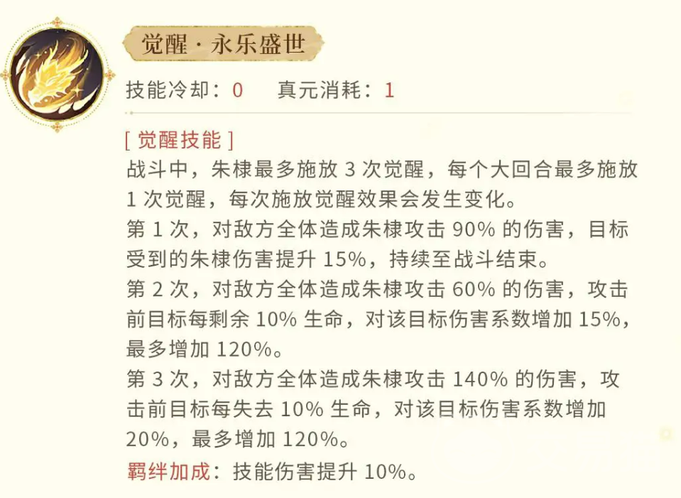 说到朱棣的觉醒技能,那可真是不得不提的亮点。每一轮觉醒技能的释放,都能在不同阶段大幅度提升朱棣的输出,简直是让敌人感受到他压倒性的力量。第一次觉醒,会对敌全体造成攻击90%的伤害,并使敌人受到的伤害提高15%,持续到战斗结束。也就是说,朱棣每一次觉醒,都会让敌人更加脆弱,直接为下一轮的输出做足准备。第二次觉醒则会对敌全体造成攻击60%的伤害,这时,目标每剩余10%的生命,朱棣的伤害系数会增加15%。换句话说,敌人生命越低,朱棣打出的伤害就越高。简直是专治高血量敌人,放大了朱棣的爆发力。第三次觉醒是最惊人的一击。朱棣对敌全体造成攻击140%的伤害,且随着敌人血量的下降,朱棣的伤害会进一步增加,最多能达到120%的增幅。简直就是让敌人后悔站在他面前。除此之外,朱棣的羁绊加成还能让他的技能伤害提升10%,让他的觉醒技能更加致命。