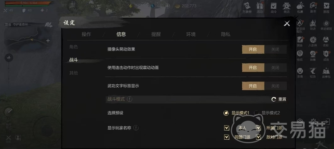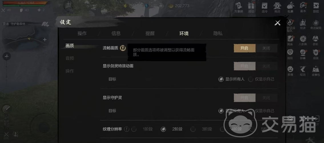 在设置页面上的显示剑灵和守护灵的特效动画没什么用,小编建议直接关闭。还有纹理分辨率、品质整体、视野距离、草丛显示、角色品质显示等与战斗体验没有关系的,全部调到最低层次,这样可以把对游戏流畅度的影响降到最低。