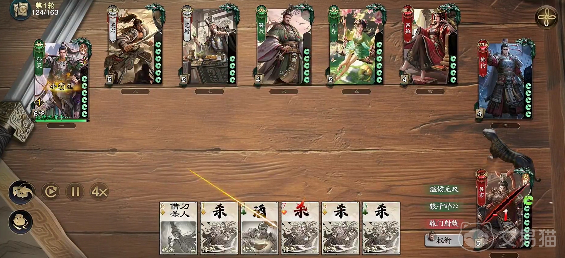 进入对局并根据身份挑好武将后,游戏会以轮流进入出牌回合的方式来进行,每次对局都将由一号位玩家先起手,通过使用手牌来对对手进行削弱,或是装上装备来强化自己。当所有人都出过一轮牌后,将会继续来到一号位的回合。代号杀里面的手牌类别可分为基础牌、战法牌等,每种类别的不同牌都有不同的用法机制,玩家们需要做的就是合理地去利用这些卡牌,去达成与自己身份相符的胜利目标。