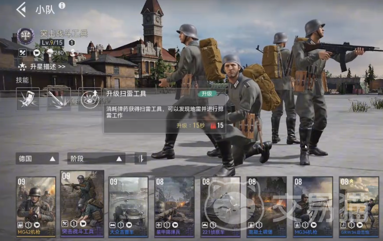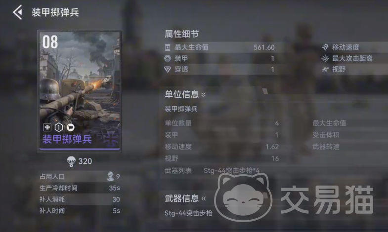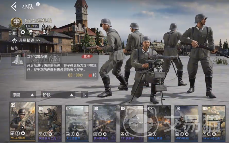 游戏里会设置几个不同的国家,因为篇幅有限,这一期会以德国的兵种为例跟大家分享,德国步兵种类相对来说是比较少的,主打的都是一些重型的装甲车辆,首先是里面有步兵,这些步兵会使用mg42重机枪攻击,他们的生命值是比较高的,并且射程也很远,虽然角色的生命值不高,但对于步兵来说是完全够用的,这个兵种有一个比较独特的技能,就是战斗到底,步兵会以5人小组的形式呈现,队伍里每少一个步兵成员,整个队伍就会额外获得伤害减免的效果,这就表示队伍的成员会越来越厉害,尤其是最后一名成员,通过设定的加成,会拥有极高的血量。