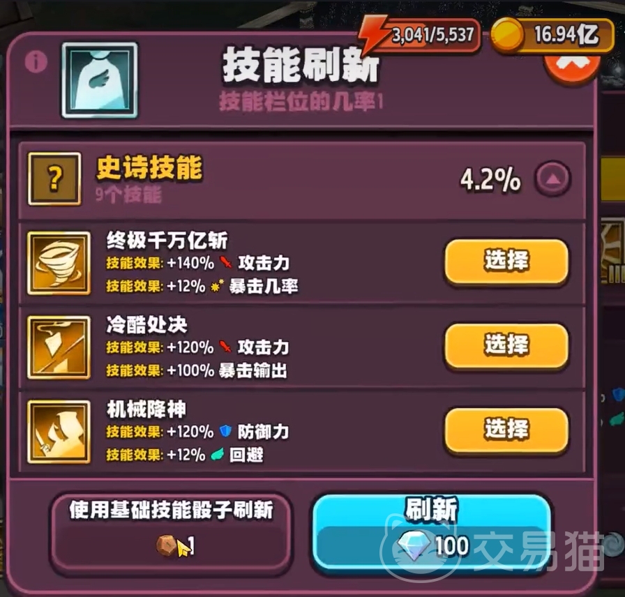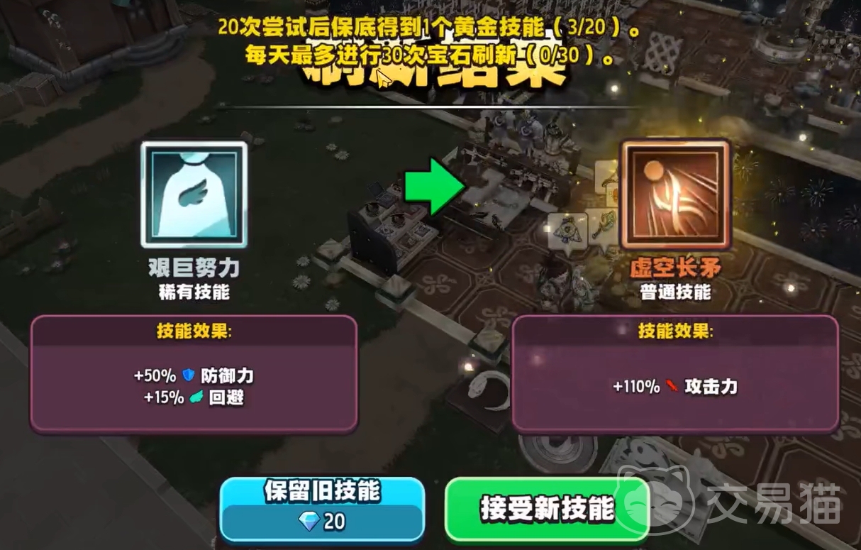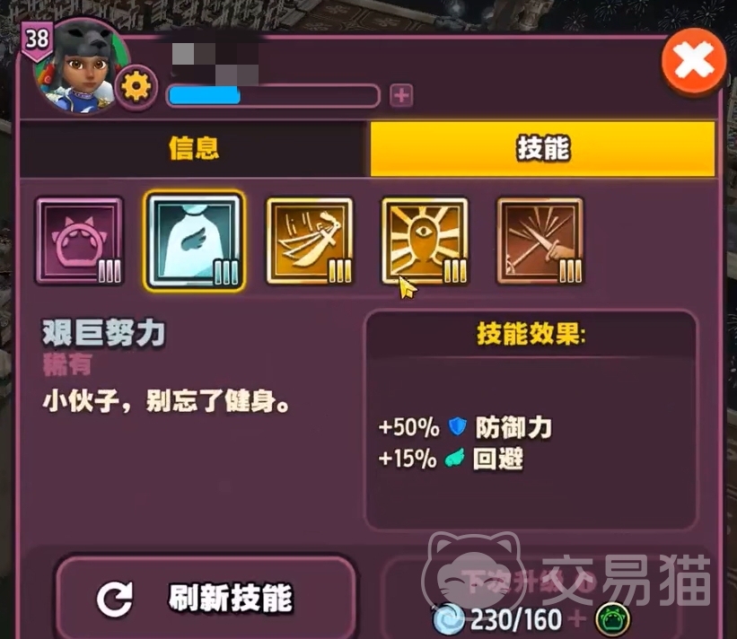 获取技能的方式很简单,各位只要在技能界面里选择想要更换的技能,然后再选刷新技能,就能为英雄随机抽取技能了。这样抽取来的技能与英雄初次解锁技能栏时所获得的技能一样,都有着很大的随机性,所以需要重复多次的刷新,才能为英雄找到一个品质和能力都合适的技能。