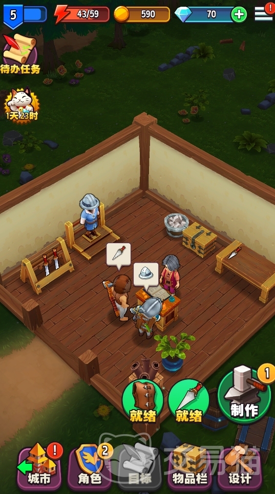将前期的剧情全部过完后,玩家将正式开启自己的经营之旅。此时玩家最该作的,就是不断地来进行装备的制作,然后将它们卖出去来完成经验累积,更快地实现升级,让自己能招募更多的工人来制作更多的装备。每次制作装备都有概率获得生成高品质装备,它们的售价会更高。