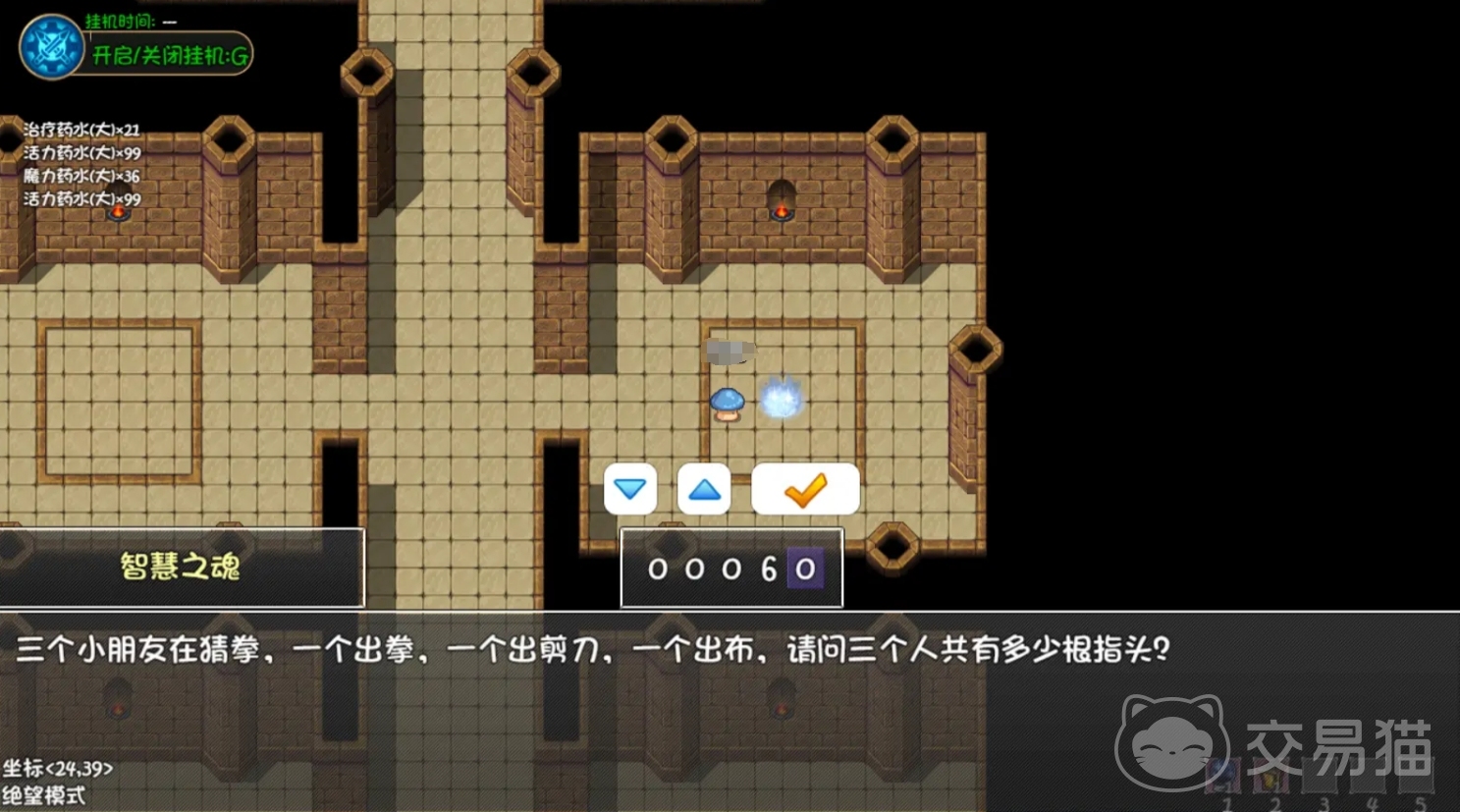 智慧挑战共有三题,每一题都是比较简单的计算题,其中水箱放水罐水的答案为83分钟,三人猜拳问有多少根指头的答案是60根(手指脚指都算上),苹果数量的题目要回答有五颗,孩子吃饼题的正解为3分钟。只要各位全部答对,就能沿路找到楼梯前往下一层挑战勇气之魂。