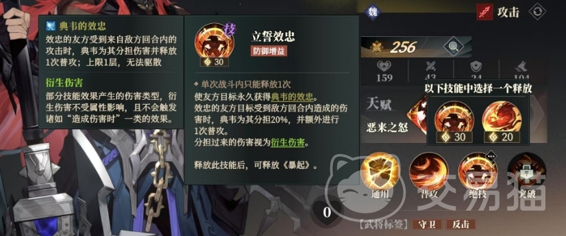 这里需要特别说明的是,典韦分担过来的这部分伤害被视为衍生伤害,所谓衍生伤害,是由部分特殊技能效果所产生的伤害类型,它具有独特的属性,不受常规的属性影响,并且不会触发诸如造成伤害时这类常见的战斗效果,这使得典韦在保护友方的同时,还能保持自身的战斗节奏和输出能力,更为重要的是典韦的效忠效果上限为 1 层,且无法被驱散。