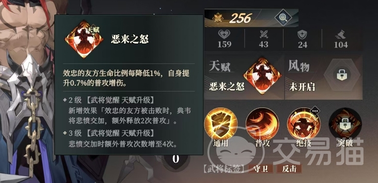典韦的天赋名为恶来之怒,在战斗过程中,只要效忠的友方生命比例每降低1%,典韦自身的普攻增伤就会提升0.7%,这使得他在友方遭受攻击时,能够越战越勇,不断地积累伤害输出能力,并且当2级武将觉醒后,会新增一个极为强大的效果,一旦效忠的友方不幸被敌方击败,典韦将会悲愤交加,在这种情绪的驱使下,他会额外释放2次普攻,而当3级武将觉醒达成时,典韦悲愤交加状态下额外普攻的次数会进一步增至4次。