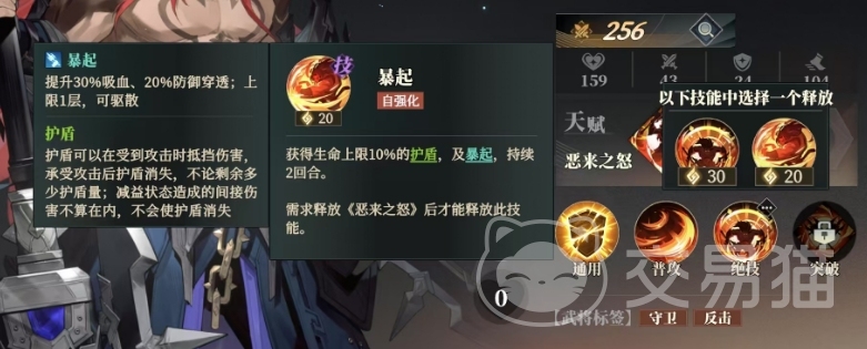 另一个绝技则是暴起,这一技能主要侧重于自我强化,当典韦成功释放暴起技能后,他将获得相当于自身生命上限10%的护盾,同时进入暴起状态,这种状态能够持续2回合,不过暴起技能的释放有一定的前置条件,需要先释放恶来之怒这一技能后才能顺利发动暴起,在暴起状态下典韦的各项战斗属性会得到显著提升,他的吸血能力将增强 30%,防御穿透能力也会提高 20%。