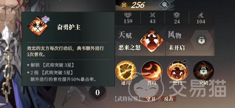 典韦所拥有的奋勇护主技能是突破技能,当该技能生效时,效忠的友方在每次行动结束后,典韦会发动一次额外的普攻,此技能在典韦达到武将突破3星,时成功解锁,而随着典韦实力的进一步提升,当他达成2级武将突破5星后,这次额外进行的普攻更是暴击率直接提升50%。