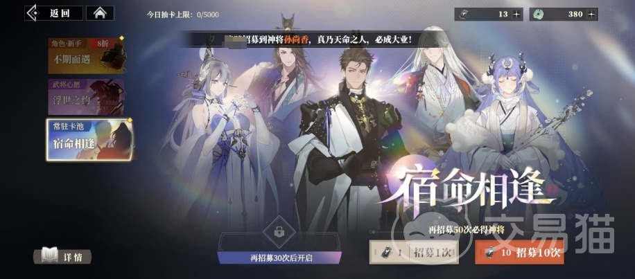 最后是宿命相逢卡池,它每次招募会固定获得100枚三山钱以及一位武将,神将出现概率1.6%,其含保底综合概率约2.8%,名将出现概率7%,良将出现概率 91.4%,每10次招募,必会获得至少一位名将,每50招募,必定会有至少一位神将降临。