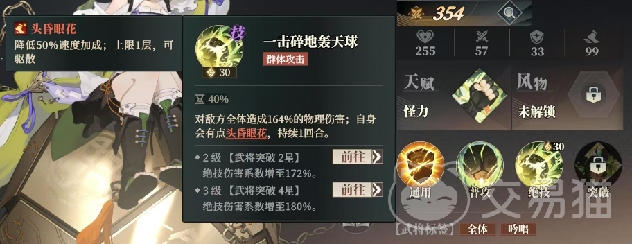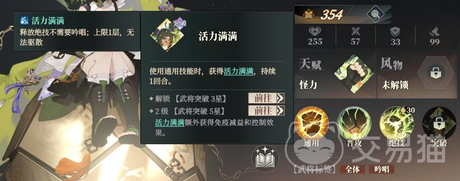 除了强大的攻击力外,关银屏还拥有一项独特的突破技能叫做活力满满,在3星的时候就可以解锁这个技能,在使用通用技能时,关银屏会获得活力满满的状态,持续1回合,活力满满的效果是释放绝技不需要吟唱,提高了她在战斗中的灵活性,而且这个状态上限只有1层,无法被驱散,当关银屏突破至2级武将突破5星时,活力满满还能额外获得免疫减益和控制效果。
