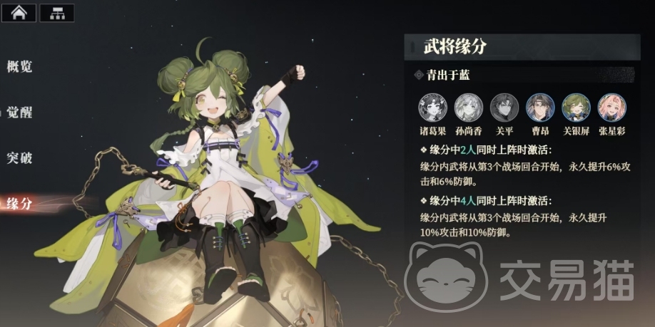 她的缘分与关平一样,都是青出于蓝的羁绊效果,这个缘分涉及到的武将有诸葛果、孙尚香、关平、曹昂、关银屏以及张星彩,当缘分中2人同时上阵时,他们会从第3个战场回合开始,永久提升6%的攻击和6%的防御,这种提升不仅增强了关银屏自身的战斗力,也让她在团队中发挥了更大的作用,而当缘分中4人同时上阵时,他们则会从第3个战场回合开始,永久提升10%的攻击和10%的防御,所以关银屏不仅拥有一些个人能力,还能通过与其他武将的配合发挥出更大的战斗力。