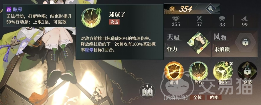 关银屏的普攻名为球球了,虽然名字可爱,但威力却不容小觑,她可以对敌方前排目标造成80%的物理伤害,并且在释放绝技后的下一次普攻有100%基础概率眩晕目标1回合,这个眩晕效果会让对手无法行动,打断吟唱,并且在结束时提升50%的行动条,值得注意的是这个眩晕效果上限只有1层,且可以被驱散。