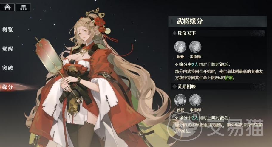 在武将缘分的羁绊效果中,步练师与甄姬、孙权之间的羁绊是可以触发的,当每当这两位武将中的任何一位回合伊始,生命比例最低的其他友方将被赋予一道温暖的护盾,其厚度等同于持有者生命上限的8%,而三个角色同在场上的时候,每当步练师释放其通用技能,不仅为队友带去恢复,自身也会在这一瞬间摆脱一个减益效果。
