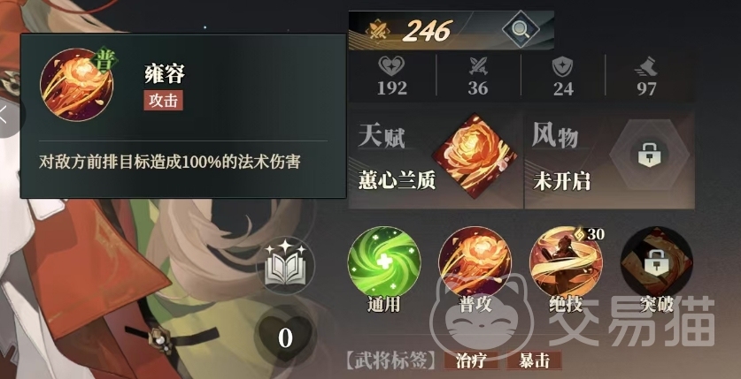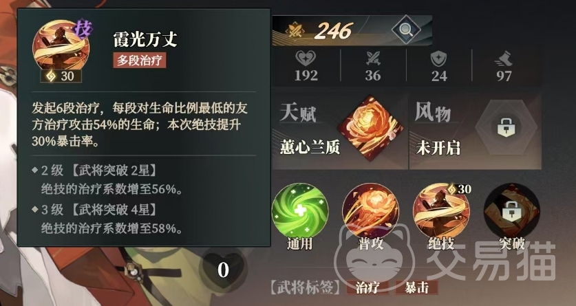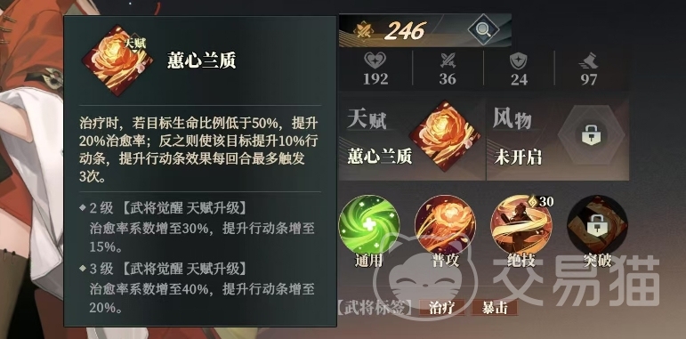 蕙心兰质是步练师与生俱来的天赋,每当她的手轻轻挥动,若受疗者的生命之泉低于半数,她将将治愈率提升20%,让濒危的队友得以重焕生机,而若对方生命尚丰,她则会为该队友增添10%的行动条,加速其下一次行动的准备,这份天赋的效果,每回合最多可触发三次,随着天赋等级的提升,二级觉醒时,治愈率系数将增至30%,行动条增益提升至15%,而三级觉醒时,更是分别达到了40%与20%的巅峰。