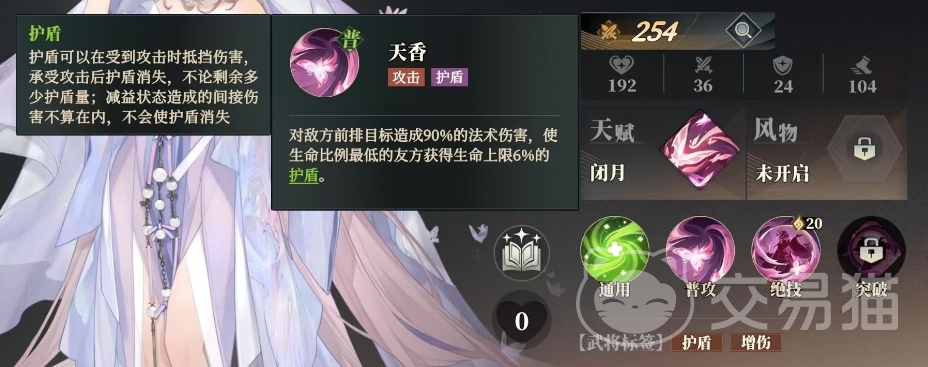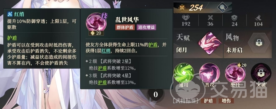 貂蝉所具备的天赋名为闭月,这一天赋在战斗中当任一友方发动攻击时,会消耗其所拥有的护盾的 10%,并将这部分消耗转化为等量的攻击提升,不过需要注意的是通过这种方式提升的攻击力存在上限限制,即不得超过该友方攻击力的 30%,随着貂蝉在武将觉醒方面不断提升天赋等级,其闭月天赋的效果也会得到增强。当达到 2 级武将觉醒时,护盾消耗的比例会增至 13%,而当貂蝉进一步觉醒至3级武将觉醒时,护盾消耗比例继续增至16%。