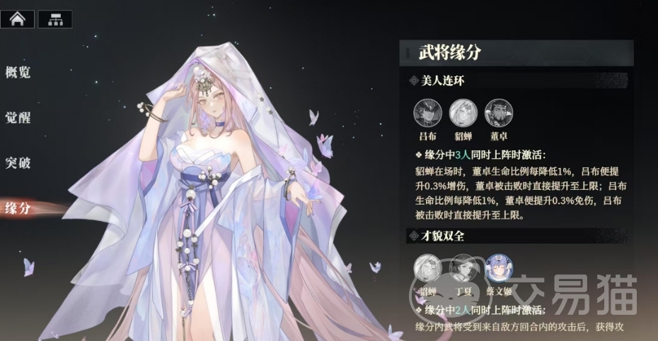 在武将缘分羁绊方面,貂蝉与吕布、董卓之间存在联系,他们可以组成美人连环的缘分组合,当他们三人同时上阵时,便会激活一系列强大的战斗效果,在貂蝉在场的情况下,每当董卓的生命比例降低 1%,吕布就会获得 0.3%的增伤效果,这种增伤效果会随着董卓生命比例的不断降低而持续叠加,直至董卓被击败时,吕布的增伤效果会直接提升至上限,反之当吕布的生命比例每降低 1%时,董卓便会自动获得 0.3%的免伤效果,同样地,这一免伤效果会随着吕布生命比例的下降而不断累积,若吕布不幸被击败,董卓的免伤效果也会即刻提升至上限。