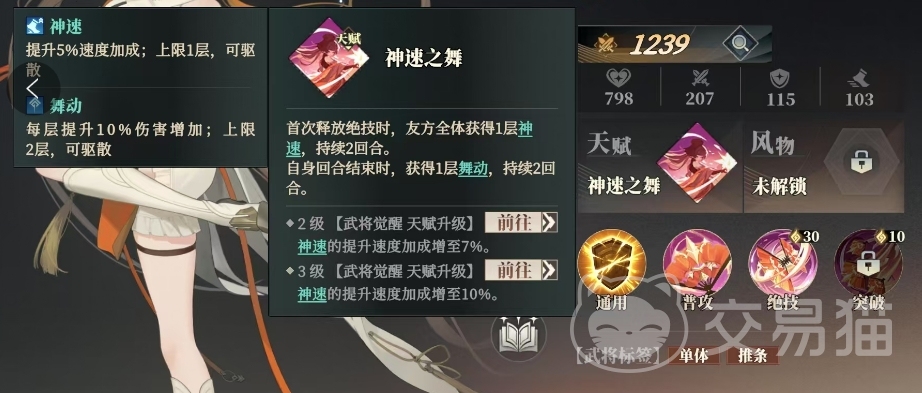 舞动这一效果更是独特,每层能够提升10%的伤害增加,而且舞动效果最多可以叠加至2层,不过需要注意的是,神速和舞动效果都有各自的上限,分别为1层和2层,并且可以被驱散,随着武将觉醒等级的提升,乔菱的天赋也会进一步进化,当达到2级武将觉醒天赋升级时,神速所带来的速度加成将增至7%,而当觉醒等级提升至3级武将觉醒天赋升级时,神速的速度加成更是猛增至10%。