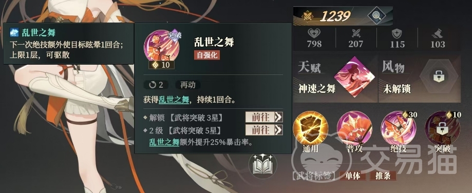 乔菱还有一个更为强大的突破技能叫做乱世之舞,这个技能带有自强化的效果,一旦获得乱世之舞,便能持续1回合,其效果能够让下一次绝技额外使目标眩晕1回合,而且这个技能上限为1层,可驱散,既保证了其强大的功能性,又避免了过于无解的平衡问题,当乔菱最终突破至2级武将突破5星时,乱世之舞会额外提升了25%的暴击率,这使得乔菱在战斗中不仅有更高的几率打出暴击伤害,而且一旦触发乱世之舞的眩晕效果,配合高暴击率的伤害输出,将对敌方造成毁灭性的打击。