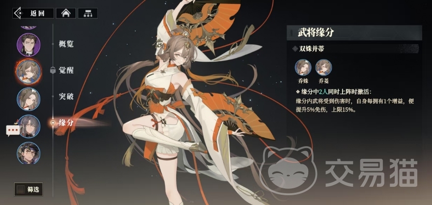 在武将缘分方面,乔菱与乔姝之间存在着一种特殊的羁绊,当缘分中的两人同时上阵时,一旦激活队内武将在受到伤害时,自身每拥有1个增益,便能够提升5%的免伤效果,这一效果最多可以叠加至15%,也就是说当乔菱和乔姝同时上阵,并且在战斗中获得了多个增益状态时,她们在面对敌方攻击时,能够凭借这一缘分效果减少所受伤害,增强自身在战场上的生存能力。