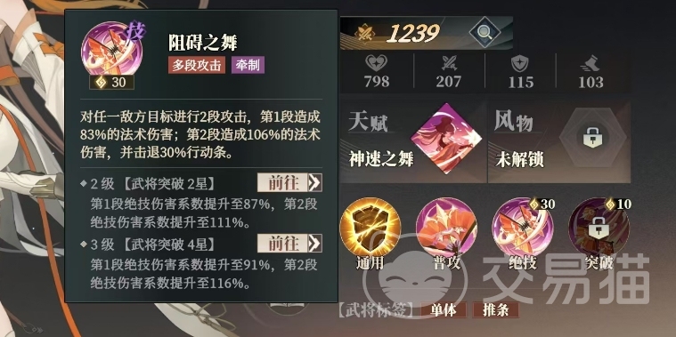 然而乔菱的真正价值体现在她的突破技能上,其中阻碍之舞这一技能堪称一绝,此技能具有多段攻击的特性,并且还附带牵制效果,能够对任一敌方目标展开2段强有力的攻击,在第一段攻击时,能造成83%的法术伤害,而紧接着的第二段攻击更是凶猛,会造成106%的法术伤害,同时还能击退敌人30%的行动条,当达到2级武将突破2星时,其第1段绝技伤害系数提升至87%,而第2段绝技伤害系数也相应提升至111%,进一步放大了这一技能的杀伤力,当乔菱突破至3级武将突破4星时,她的实力再次攀,。第1段绝技伤害系数提高到了91%,第2段绝技伤害系数也提升至116%。