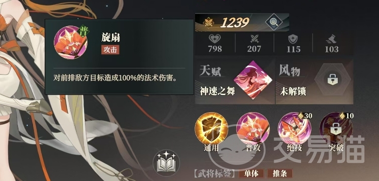 先来说说她的普攻旋扇,这一招式在战斗中表现较为一般,主要是对前排敌方目标造成100%的法术伤害,虽然看似没有太过于亮眼的能力,但在前期的一些小规模冲突或者面对单个敌人时,也能为队伍提供稳定的输出伤害。
