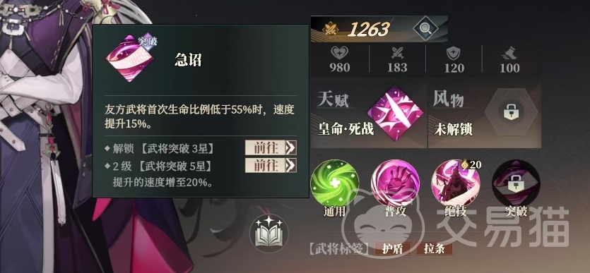 除了绝技之外,蹇硕的突破技能急诏也不容小觑,当友方武将首次生命比例低于55%时,他会迅速响应,为队友提供速度提升15%的紧急支援,这一技能在关键时刻往往能扭转战局,让队友在危难之际重获生机,而当蹇硕突破至5星时,这一速度提升更是增至20%,进一步巩固了他在战场上的辅助地位。