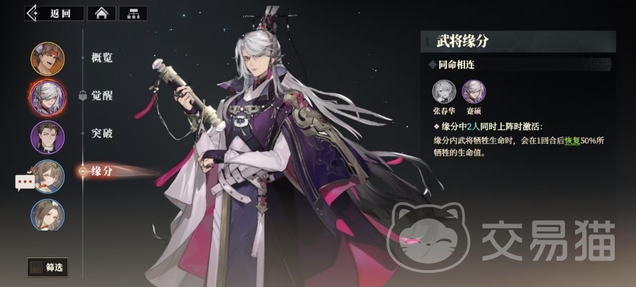 而当蹇硕与张春华并肩作战,同命相连的武将缘分羁绊效果就可以激活,在这份缘分的交织下,每当缘分内武将因战斗而牺牲生命时,就会给予他们1回合的短暂喘息时间,在这一回合结束时,那些为了胜利而不惜牺牲生命的武将们,因为这个羁绊的效果将奇迹般地恢复50%所牺牲的生命值,相当于是一个很强的回血效果哦。
