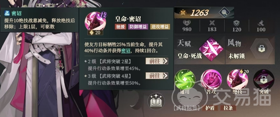 这层密诏如同战神的庇护,能提升10点绝技战意减免,让队友在关键时刻更具韧性,释放绝技后,密诏效果虽会移除,但其带来的优势却已在战斗中发挥了至关重要的作用,随着蹇硕在游戏中的成长与突破,他的绝技也不断得到升华,2星突破时,提升行动条效果增至45%,让队友的行动更加迅速,4星突破时,这一效果更是达到了50%,使蹇硕的辅助能力上升的空间更多了。
