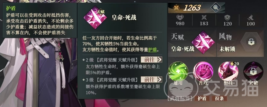 蹇硕以其独特的天赋皇命·死战带来更丰富的效果,每当任一友方回合一开始,若其生命比例高于70%,便会自动牺牲5%的当前生命唤醒潜藏的力量,而这份牺牲是化作了等量的护盾,当2级武将觉醒天赋升级的时候,蹇硕的守护之力更上一层楼,此时每当友方因他的天赋而牺牲生命时,不仅会获得等量的护盾,更将额外获得相当于蹇硕生命上限5%的护盾加成。