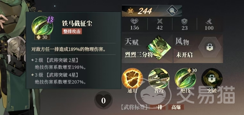 能够对敌方任一排造成189%的物理伤害,这种强大的群体伤害能力随着关平实力的不断提升,他的绝技伤害系数也会相应增加,当达到2级武将突破2星时,绝技伤害系数增至198%,而当达到3级武将突破 4星后,伤害系数更是高达207%。