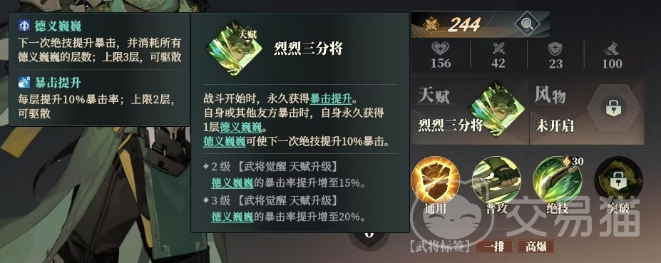 烈烈三分将是关平的天赋效果,这一天赋赋予了关平非凡的战斗能力,在战斗开始时,关平会永久获得暴击提升,这让他的攻击更具杀伤力,无论是自身还是其他友方暴击时,关平都会永久获得1层德义巍巍,德义巍巍是一种强大的效果,它能够让关平的下一次绝技提升10%的暴击率。当达到2级武将觉醒天赋升级后,德义巍巍的暴击率提升增至15%,而当达到3级武将觉醒天赋升级时,德义巍巍的暴击率提升增至20%。