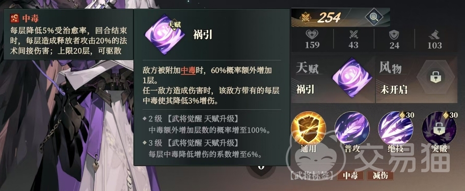 李儒这位来自群雄阵营的武将,不仅以其策略性的中毒技能闻名,更拥有着独特的天赋祸引,每当敌方不幸踏入他布下的毒圈,有60%的几率会被额外笼罩一层黑暗的毒雾,而当战场上任何敌人试图发起攻击,他们所携带的每一层中毒状态,都将成为另外一种输出增益,每层降低其3%的增伤能力。,随着李儒对天赋的不断领悟,二级觉醒后的他,能将中毒额外增加层数的概率提升至百分之百,三级觉醒,则进一步削弱了敌人的反击力,每层中毒降低增伤的系数攀升至6%。