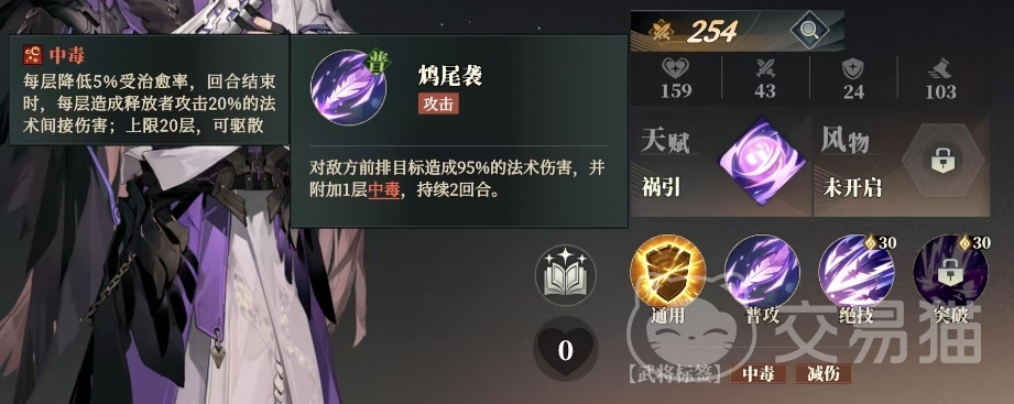 李儒的普攻鸩尾袭,会精准打击敌方前排,留下95%的法术伤害印记,并附带一层持续两回合的中毒状态,这中毒的效果不仅可以侵蚀敌人,每层还削弱其5%的受治愈率,还可以逐渐瓦解对手的防御,而当回合结束的钟声敲响,每层中毒又化作释放者攻击20%的法术间接伤害,上限可以达到二十层,所以就算这个效果可以驱散,却也令人防不胜防。