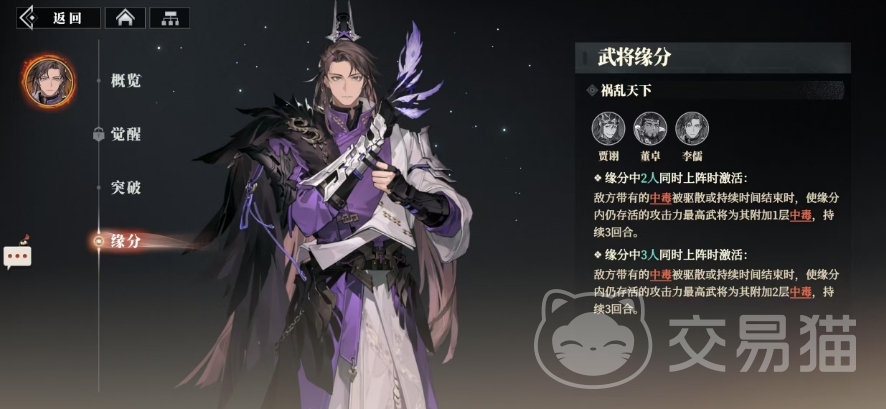 更为精妙的是李儒与其他两位武将贾诩、董卓之间的羁绊,他们祸乱天下的羁绊效果是,当其中两人并肩作战,每当敌方的中毒状态被驱散或自然结束时,存活下来的攻击力最强者将会被附上一层新的中毒,持续三回合,而当这三个角色激活了最深层的羁绊时,那份诅咒也升级为两层,在这样的组合下,李儒不再是那个单纯依靠智谋取胜的谋士,而是成为了一个能够操控战局、左右胜负的关键角色。