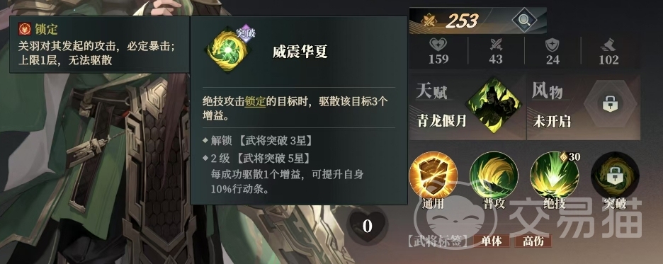 威震华夏是他突破达到一定条件之后可以用的技能,只要绝技攻击锁定目标时,就能驱散该目标的3个增益效果,而且在2级武将突破5星时,每成功驱散1个增益之后,关羽还能额外获得自身10%的行动条提升。这种能力不仅削弱了敌人,也为关羽提供了更多的出手机会,此外这个技能带来的效果当中,关羽还具备一种独特的锁定效果,当他对敌方发起攻击时,这次攻击必定会暴击,增加了伤害输出。这种锁定效果上限只有1层,且无法被驱散,保证了关羽在关键时刻的爆发能力。