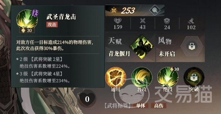 他的普攻名为青龙,能够对敌方前排目标造成100%的物理伤害,绝技输出的时候它可以堆积针对对面的一个角色,然后造成214%的物理伤害,并且此次攻击还能获得30%的暴伤加成,当关羽突破至2级武将突破2星时,绝技的伤害系数会进一步提升至224%,而在3级武将突破4星时,这一系数更是高达234%。这样的伤害提升使得关羽在战场上的威胁力大增。