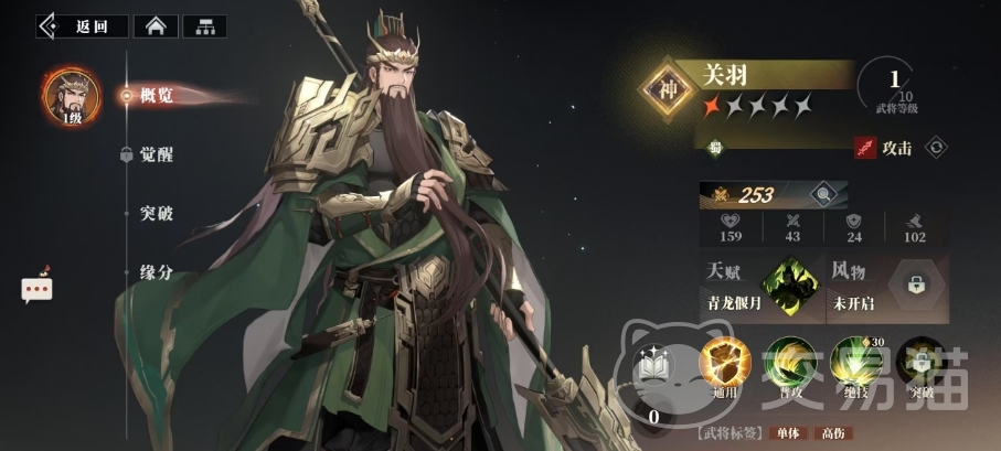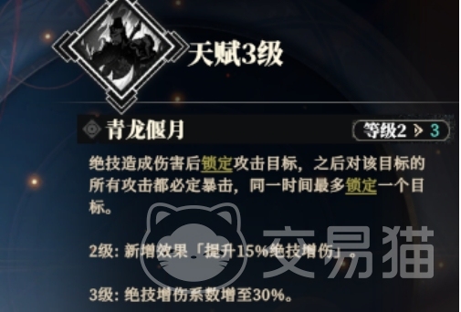 关羽的天赋名为青龙偃月,这一独特的天赋使得他在绝技造成伤害后能够锁定目标,随后对该目标的所有攻击都会变成暴击,这种天赋不仅提升了关羽的输出能力,还使得他在面对单个敌人时更加致命,觉醒天赋后关羽的绝技系数还能得到最多30%的提升,进一步增强了他的培养潜力,从这样的特点来看,关羽显然定位为单体高伤武将,他的绝技倍率极高,而且可以通过天赋获得进一步强化,在2级武将觉醒天赋升级时,关羽将获得额外的效果,就是提升15%绝技增伤,而在3级武将觉醒天赋升级时,绝技增伤系数将增加到30%,这样的设计使得关羽在战斗中能够迅速削减敌方核心单位的生命值。
