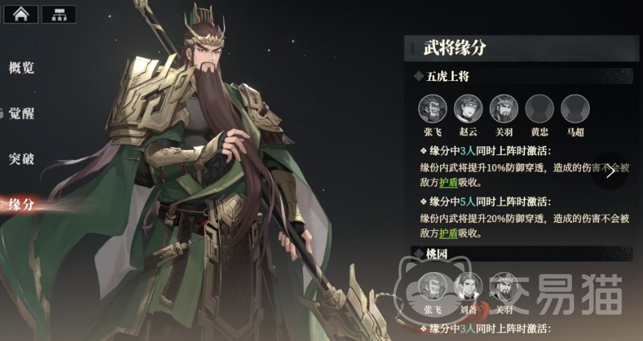 除了个人天赋外关羽的武将缘分也非常丰富,他与张飞、黄忠、赵云、马超共同组成了五虎上将的羁绊当,其中3人同时上阵时,缘分内的武将将获得10%的防御穿透,这意味着他们的攻击可以无视敌方护盾,直接对敌方造成伤害,而当5人同时上阵时,这一效果将提升至20%,此外关羽还与张飞、刘备有着桃园缘分羁绊,当这三人同时上阵时,如果任一武将被击败,其他同缘分武将将获得10%的攻击力提升和50%的行动条提升。