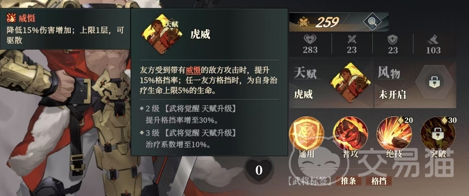 孙坚天赋虎威,不仅是体现在辅助效果上面的处世能力,因为其具体机制是在战斗中,每当友方受到带有威慑效果的敌方攻击时,孙坚便能够提升自身15%的格挡率,这一增益在友方每一次成功格挡敌方攻击时还有其他的治疗效果,不过只有5%的生命值的恢复数值,这一治疗效果进一步体现了孙坚作为防御角色的辅助价值。