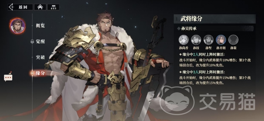 孙坚还与其他孙家武将有着深厚的羁绊关系,这一羁绊效果被称为孙吴传承,当孙尚香、孙权、孙坚、孙开朗以及孙策这五位武将中的任意两位同时上阵时,在战斗开始时,缘分内武将将获得10%的增伤效果,而到了第三个战场回合后,这一增益效果将转变为10%的免伤效果,当这五位武将中的任意三位同时上阵时,羁绊效果将得到进一步的提升,在战斗开始时,缘分内武将将获得高达15%的增伤效果,而到了第三个战场回合后,这一增益效果同样会转变为免伤效果,但免伤比例将提升至15%。
