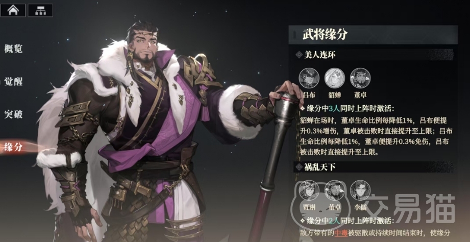 在武将缘分方面,董卓有着多种强大的羁绊效果,首先是美人连环,当他与吕布、貂蝉一同上阵时,会激活一系列特殊的效果,如果貂蝉在场,董卓的生命比例每降低 1%,吕布便能够提升 0.3%的增伤效果,而当董卓不幸被击败时,吕布的增伤效果将直接提升至上限,反之吕布的生命比例每降低 1%,董卓便能够获得 0.3%的免伤效果,若吕布被击败,董卓的免伤效果也会直接达到上限。这种相互扶持的羁绊效果,使得他们在战场上能够相互配合。