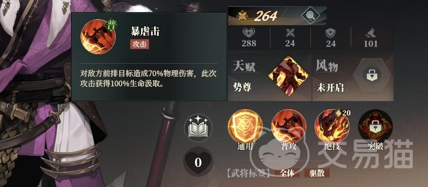 董卓的普攻名为暴虐击,这是一招具有强大吸血效果的物理攻击,当他使用暴虐击时,会对敌方前排目标造成高达 70%的物理伤害,更为惊人的是此次攻击还会为董卓带来 100%的生命汲取效果,这意味着他能够在攻击敌人的同时,迅速恢复自身的生命值,在激烈的战斗中,这一技能让董卓拥有了出色的续航能力,使他可以在敌阵中持续作战。